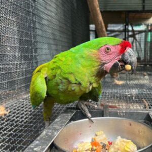 Alpha is a male Military Macaw, easily recognized by his bold green feathers, red forehead, and striking blue-tipped wings. He’s hand-tamed, fully vaccinated, and accustomed to handling, making him safe and gentle around both adults and children. He adores female owners, responds well to affection, and loves being cuddled or scratched.